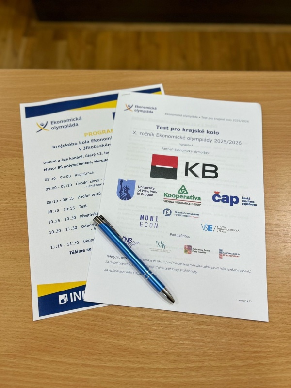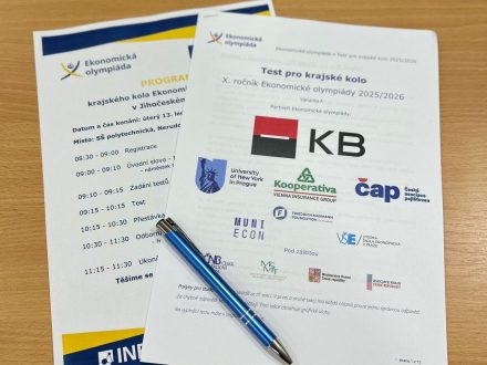 V úterý 13. ledna se na Střední škole polytechnické v Českých Budějovicích uskutečnilo krajské kolo Ekonomické olympiády. Naši školu v soutěži reprezentovali studenti 2. A – Miroslav Pekař, Jakub Štěpáník a Matyáš Valtr, a studentka 4. B – Tereza Plášilová.